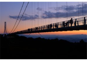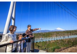 吊橋の上からは日本一高い富士山と日本一深い駿河湾を眺めながら空中散歩ができます。さらに大空を羽ばたく鳥になった気分を味わえる、往復560mの「ロングジップスライド」など大自然の中でアクティビティを体験することができます。また、地元食材を使用したグルメやここでしか食べられない「そらソフト」もおすすめです。