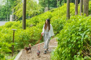 ワンちゃんも入場可能です。散策路で散歩したり、ドッグランで遊んだり、一緒に食事をしたりできます。(吊橋の上では、ペットカートに乗せていただきます。)