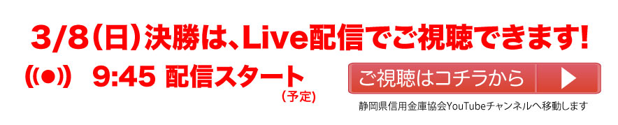 仲間への思いやりがチームプレーには大切です。みんなの気持ちをひとつにし、目標にむかって突き進んでください!静岡県の信用金庫は子供たちを応援し続けています。ぜひ、3/8(日)決勝戦ライブ配信をご視聴ください!![]()