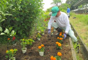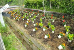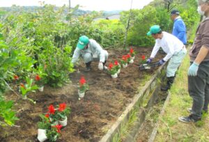 2025年5月12日(月)に、天竜浜名湖鉄道のフルーツパーク駅で、浜松フルーツパーク時之栖の従業員様と浜松いわた信用金庫SDGs推進部の職員が植栽活動を行いました。3種類の花、サルビア、メランポジウム、マリーゴールドをはままつフルーツパーク時之栖園長の村上様より花の植え方を教わりながら、1つ1つ丁寧に植栽しました。
