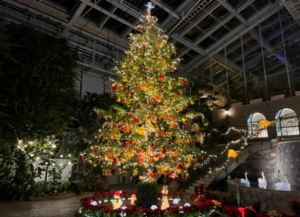 特に注目していただきたいのは、園内にそびえ立つ高さ8mのモミの木の巨大なツリー。キラキラと輝くその姿は、クリスマスムードを一気に盛り上げてくれます。さらに、大温室「クリスタルパレス」では、華やかなポインセチアなどの季節の花々とイルミネーションが融合し、温かな光に包まれた特別な空間が広がります。