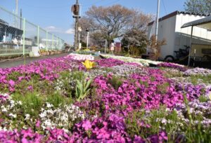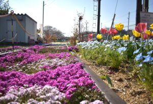 桜木駅の凄みは、頭上だけではありません。足元には、アダプトメンバーの方が丹精込めて育てた「花のリレー・プロジェクト」の成果が広がります。
