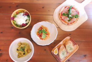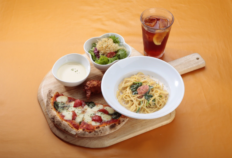 ランチタイムには、パスタやピザを中心としたセットメニューが揃い、サラダやスープ付きで満足度の高い内容。平日でも多くの人で賑わいます。