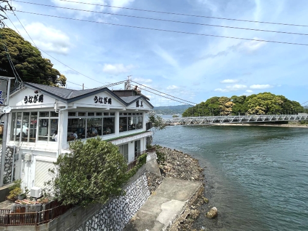 猪鼻湖の名所「新瀬戸橋」のふもとにある【うなぎ処 勝美本店】