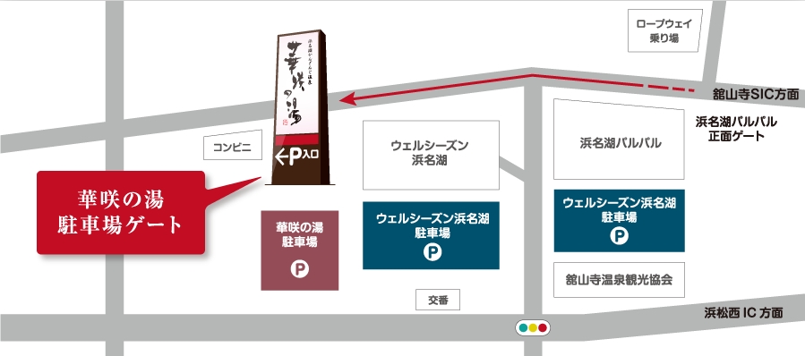 駐車場 あり ※ 日帰り入浴・ランチバイキングのお客様は「華咲の湯 駐車場」の入口をご利用ください。