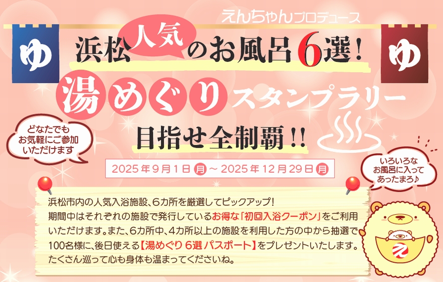 2025年12月29日(月)まで、えんちゃんがプロデュースしている「湯めぐりスタンプラリー」を開催中! 華咲の湯さんもエントリーしているので、参加いただいた方はお得な入浴クーポンが使えますよ♪ この機会にぜひ足を運んでくださいね!