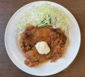 洋食の定番にして看板級のメニューが チキンソテー。香ばしく焼き上げられた鶏もも肉に、醬油ベースで甘めの特性ステーキソースが絶妙でご飯が進む逸品。ボリューミーながら飽きのこない味わいで、地元ラジオ番組でも「箸が止まらない」と紹介されるほどです。